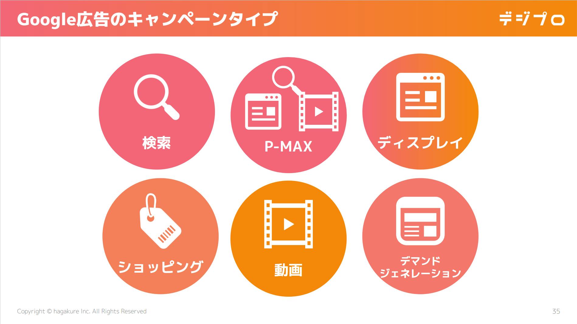 それぞれのキャンペーンタイプによって、配信できる場所や広告の形式、目的、特徴などが異なります。