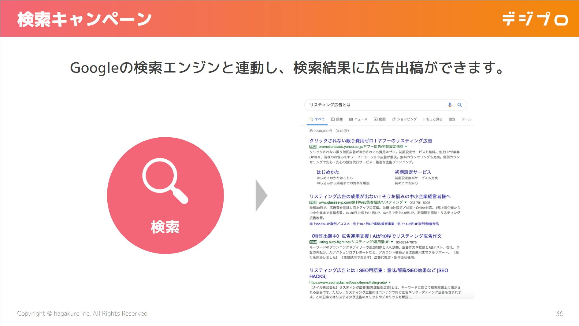 検索キャンペーンで配信される広告は、ユーザーがGoogle検索エンジンで特定のキーワードを検索した際に、検索結果画面に表示される広告です。検索結果ページの上部や下部にテキスト形式で表示されます。