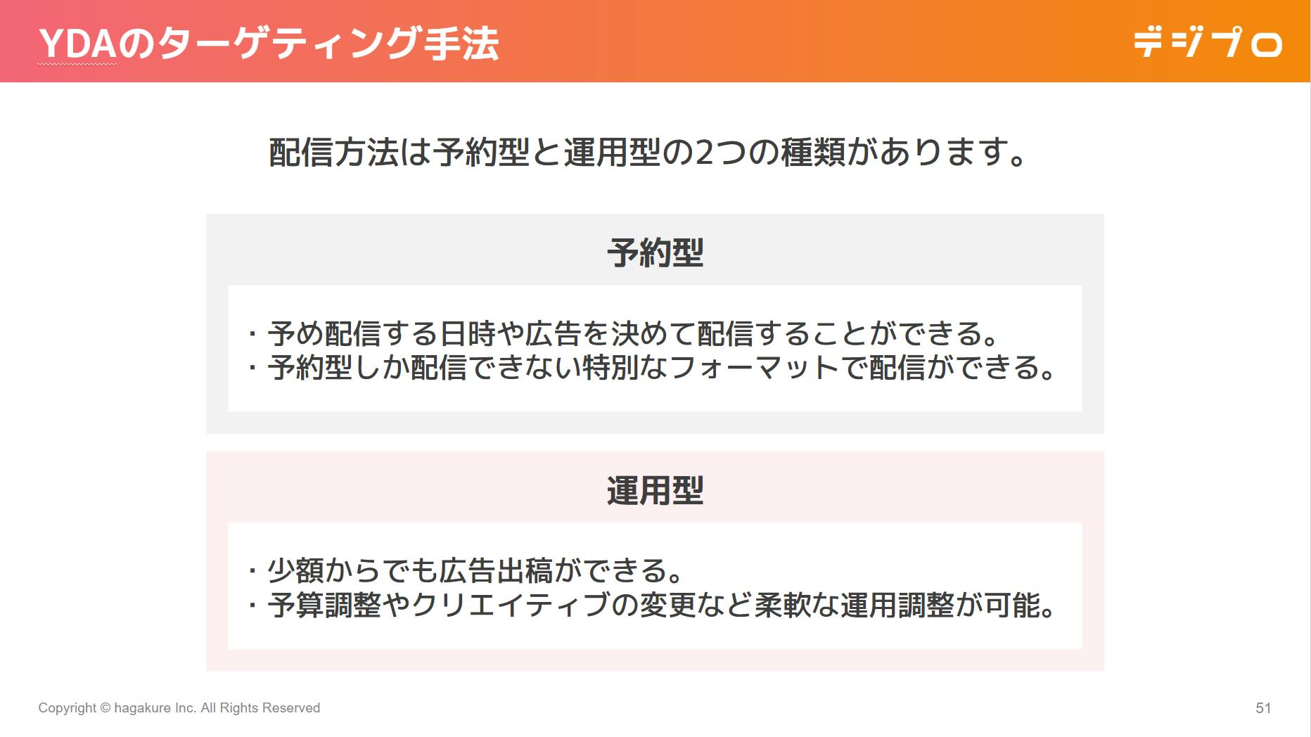 予約型広告:事前の広告枠の確保など、必要なことは広告配信前にすべて設定します。そのため、キャンペーン期間中に広告内容や表示場所を変更することは難しい場合があります。
