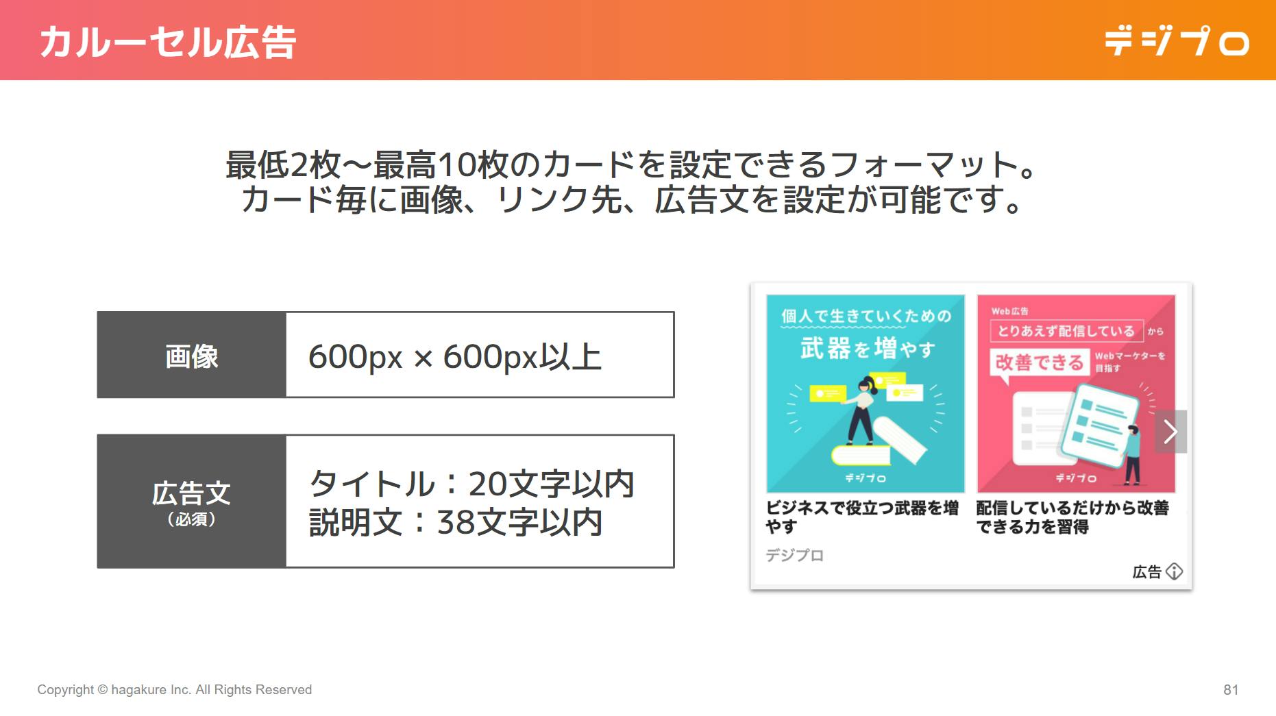 カルーセル広告は、複数の画像や動画をスライド形式で表示する広告形式です。スライドごとに画像や広告文、URLを設定することができます。