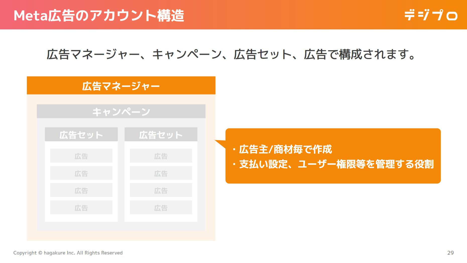 Meta広告のアカウント構造は、ほかの主要広告プラットフォームと同じように「広告マネージャー」「キャンペーン」「広告セット」「広告」で構成されています。